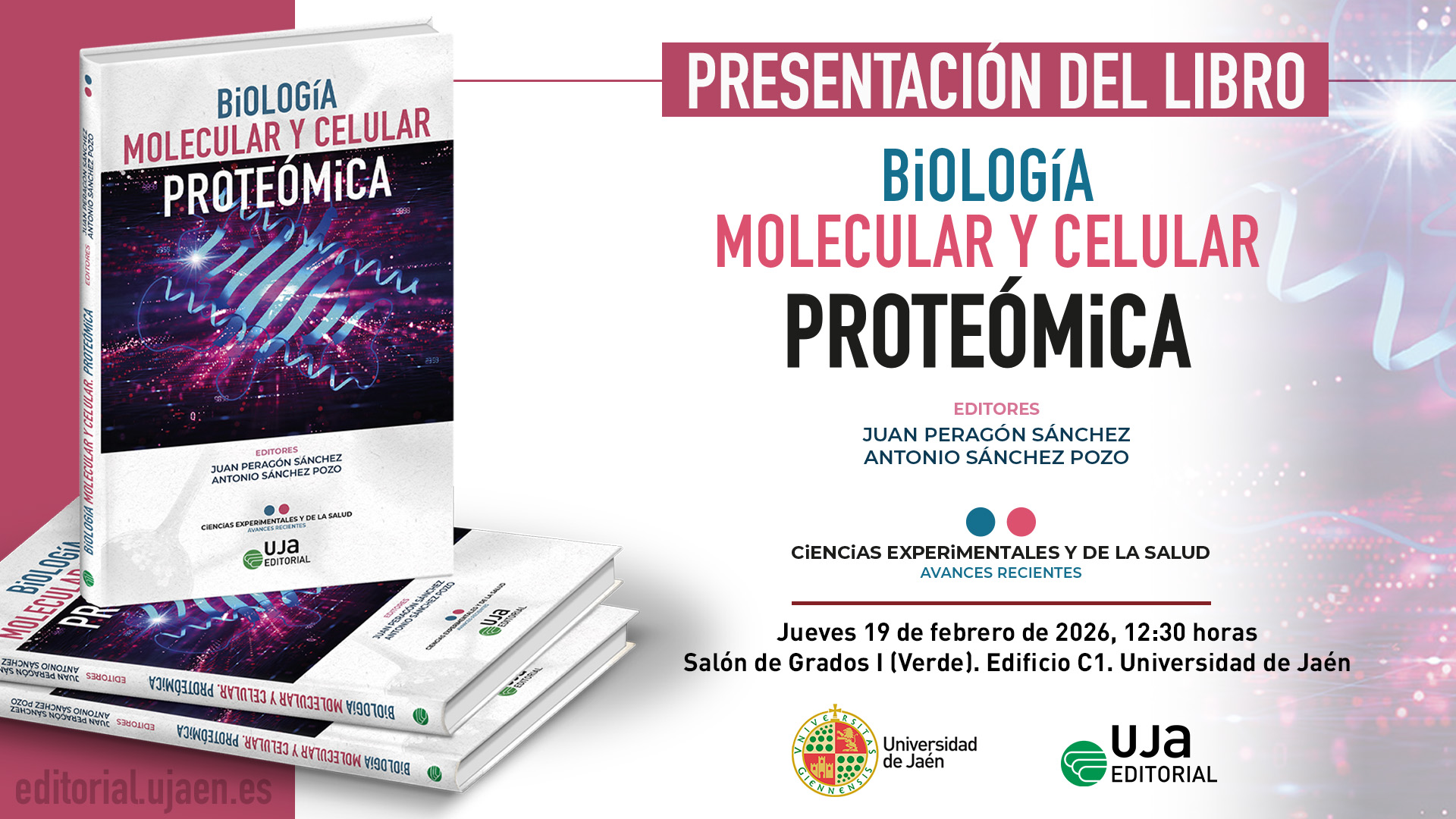 La Universidad de Jaén, a través de su sello UJA Editorial, presentará el próximo jueves 19 de febrero el libro titulado Biología Molecular y Celular: Proteómica. El evento tendrá lugar a las 12:30 horas en el Salón de Grados I (Verde), ubicado en el Edificio C1 del Campus Las Lagunillas.